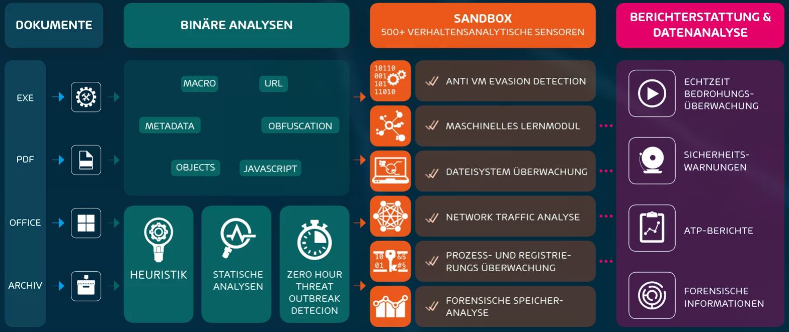| Sandbox-Engine | Dateianhänge werden in einer Vielzahl verschiedener Systemumgebungen ausgeführt und ihr Verhalten analysiert. Stellt sich heraus, dass es sich um Malware handelt, werden Sie benachrichtigt. Schützt vor Ransomware und Blended Attacks. |
